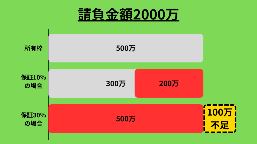 一方、保証割合が30%となるケースでは 必要な保証金額が600万円となるため、 与信枠500万円では不足します。
